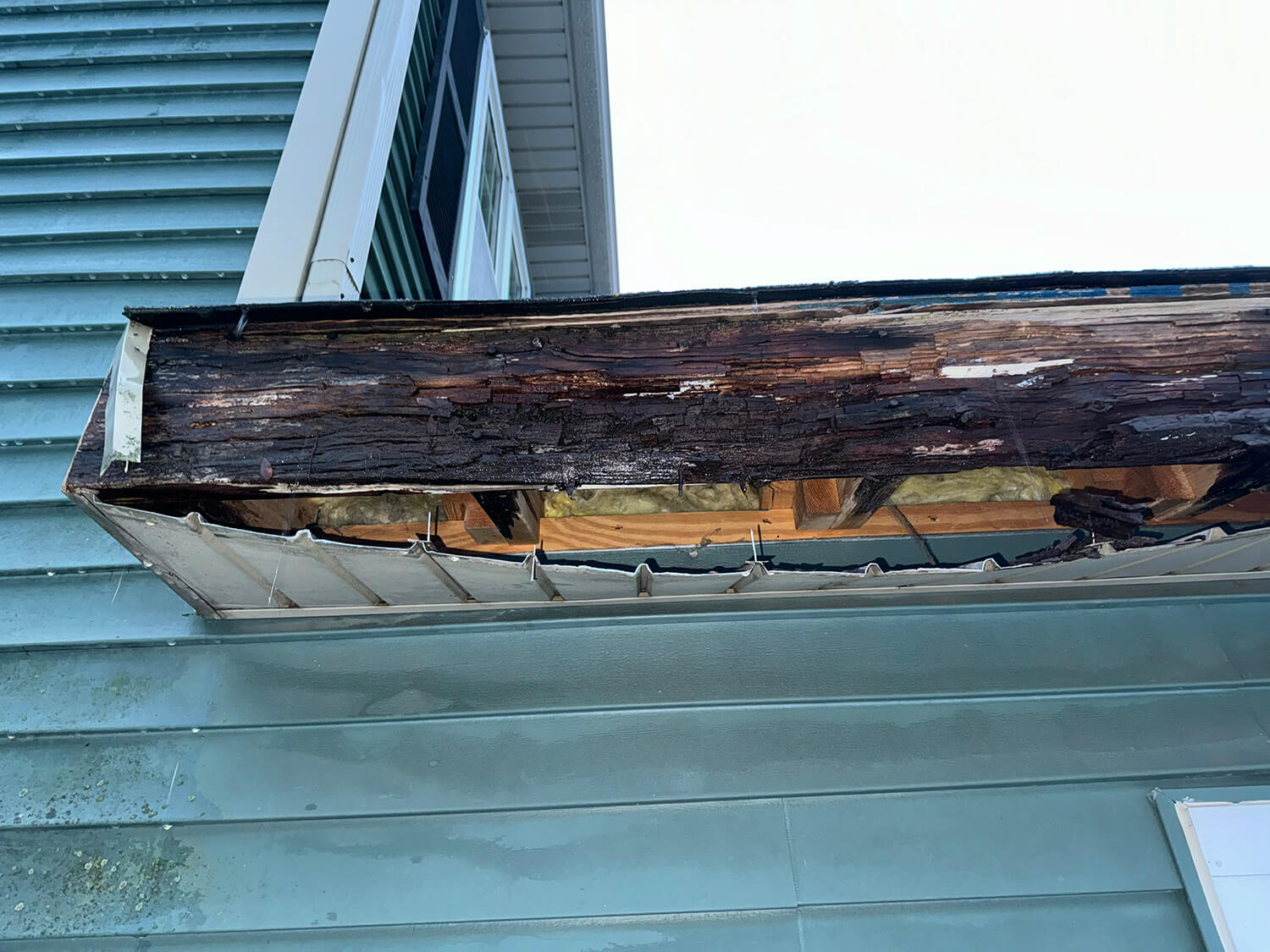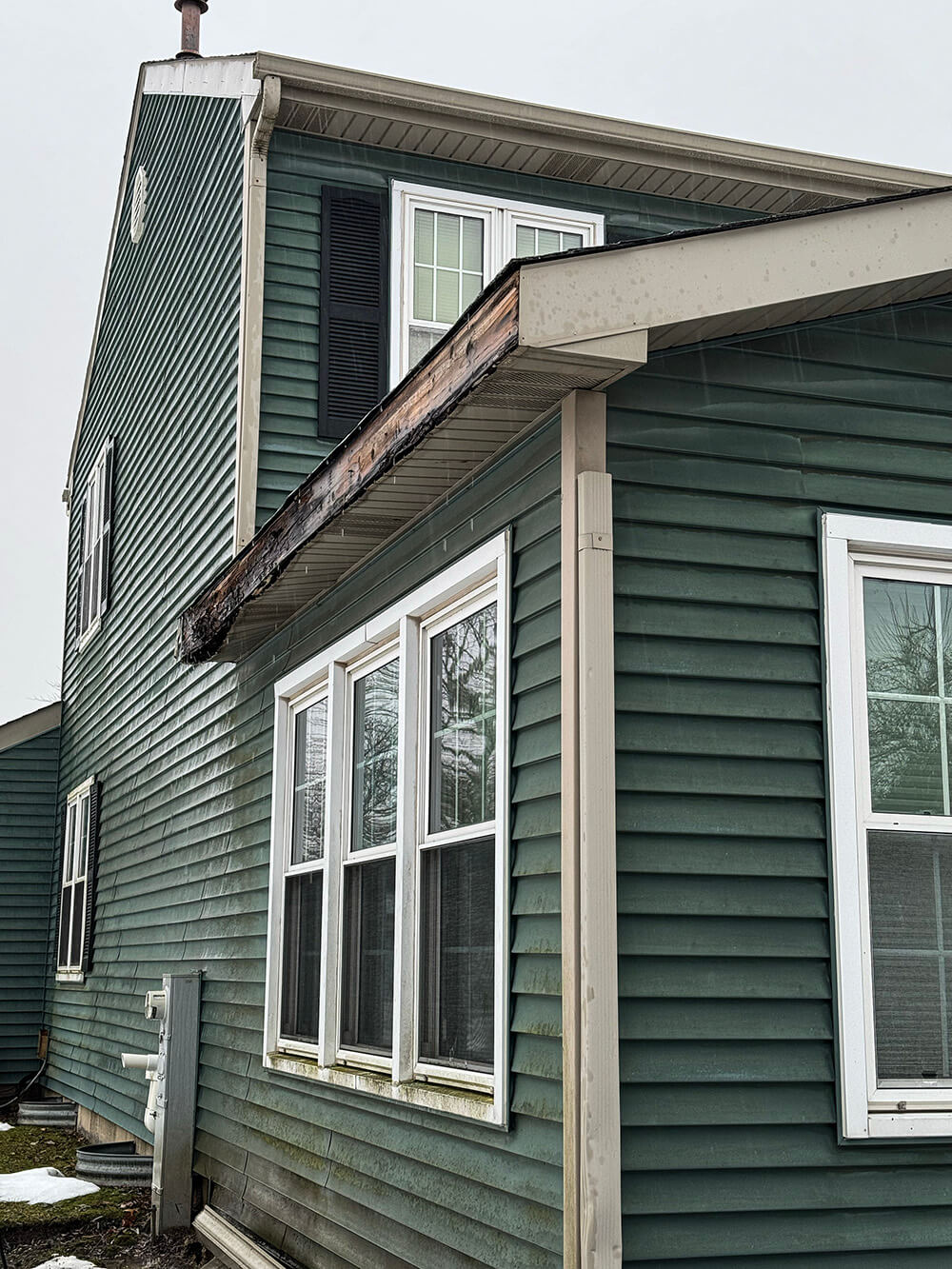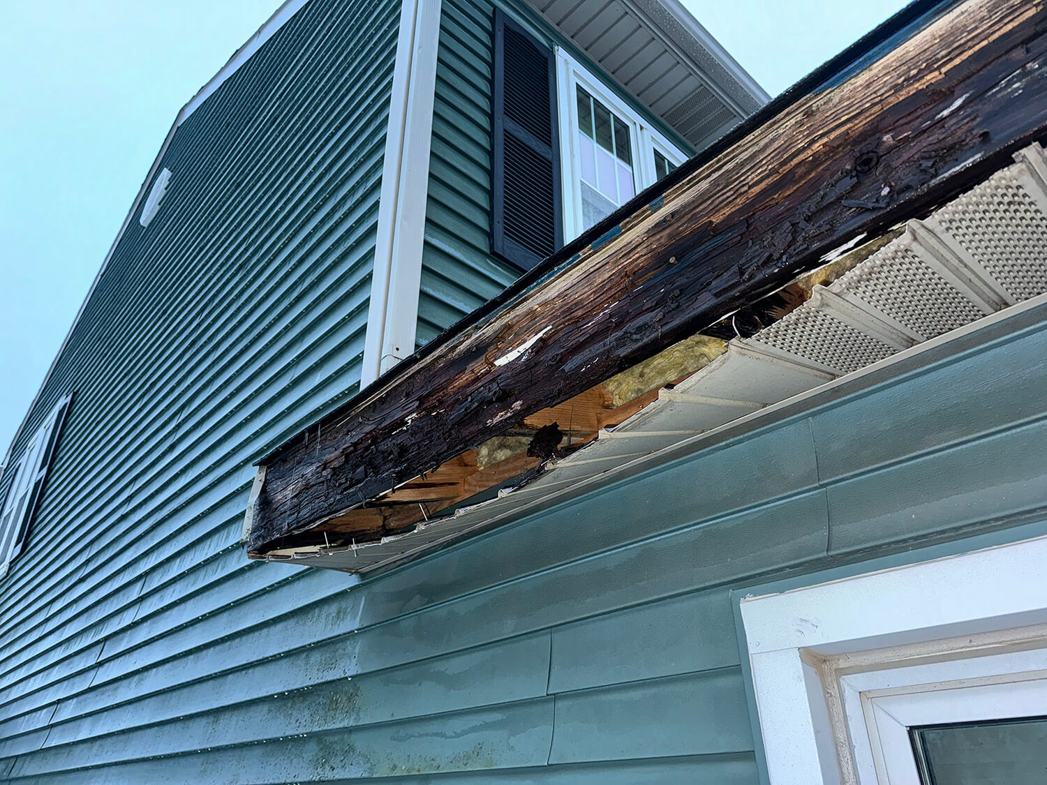 The rotted fascia and detached gutter signified not only an immediate risk of further structural damage but also potential safety hazards. Continuous water damage could lead to more extensive deterioration of the home’s exterior, potentially affecting its overall structural integrity.